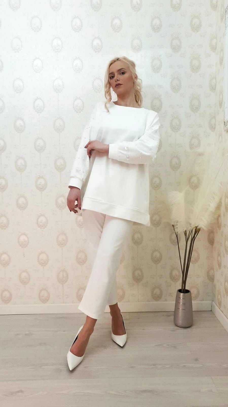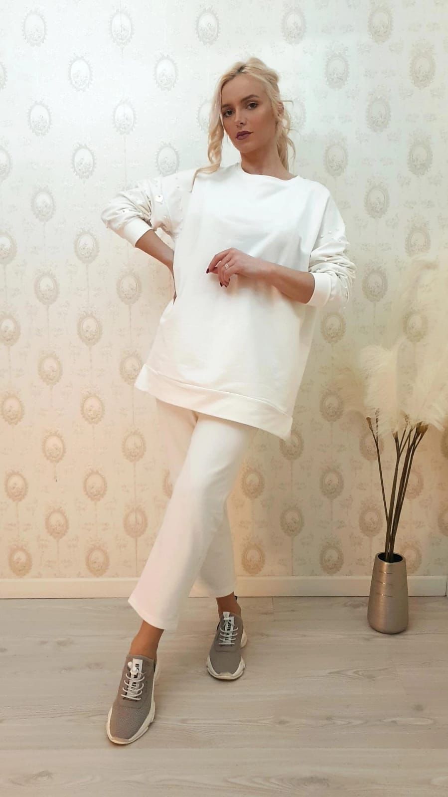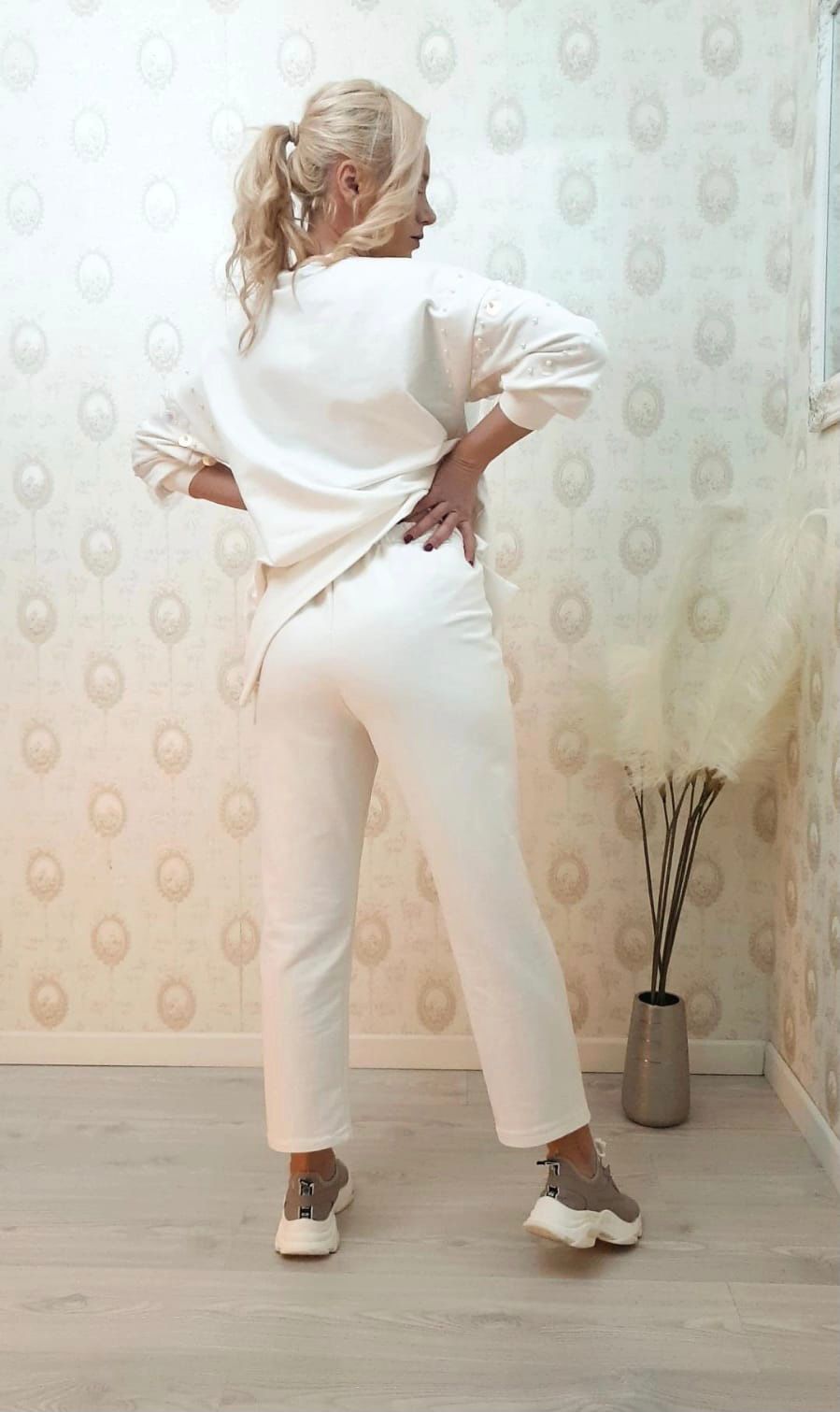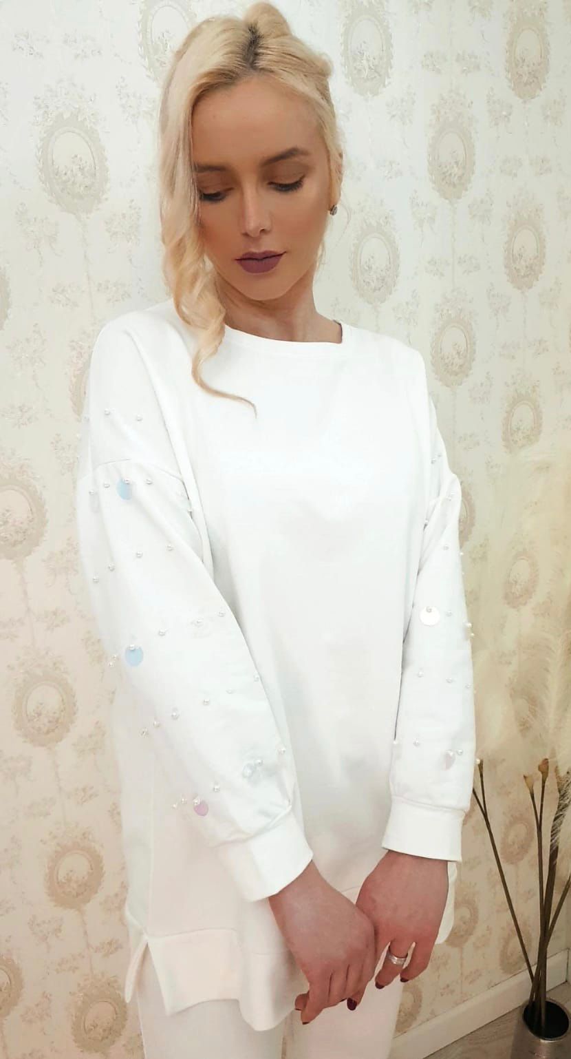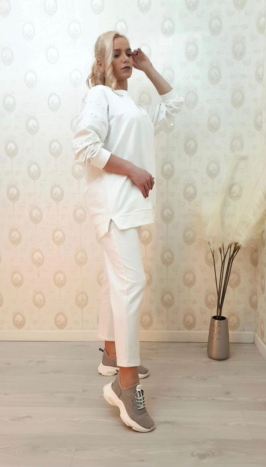 Compleu casual din bumbac cu perle pe maneca