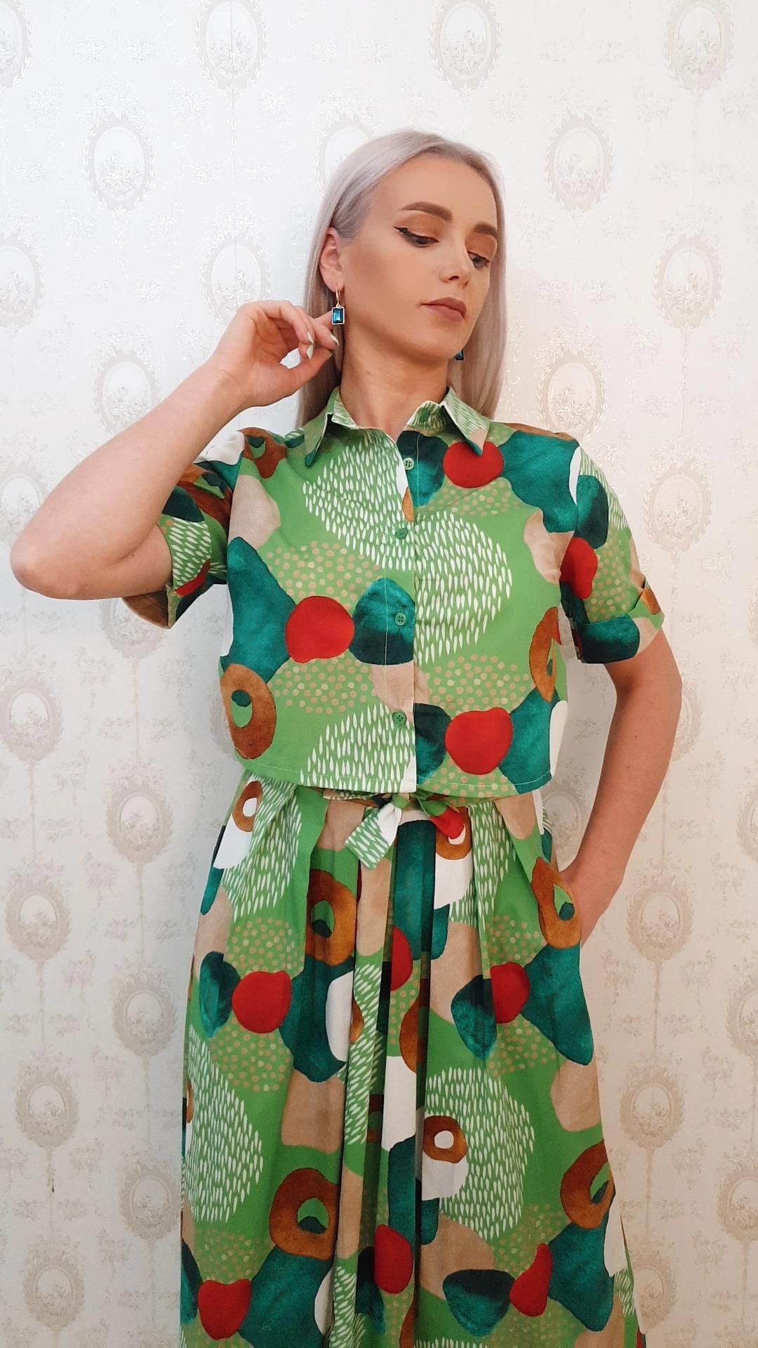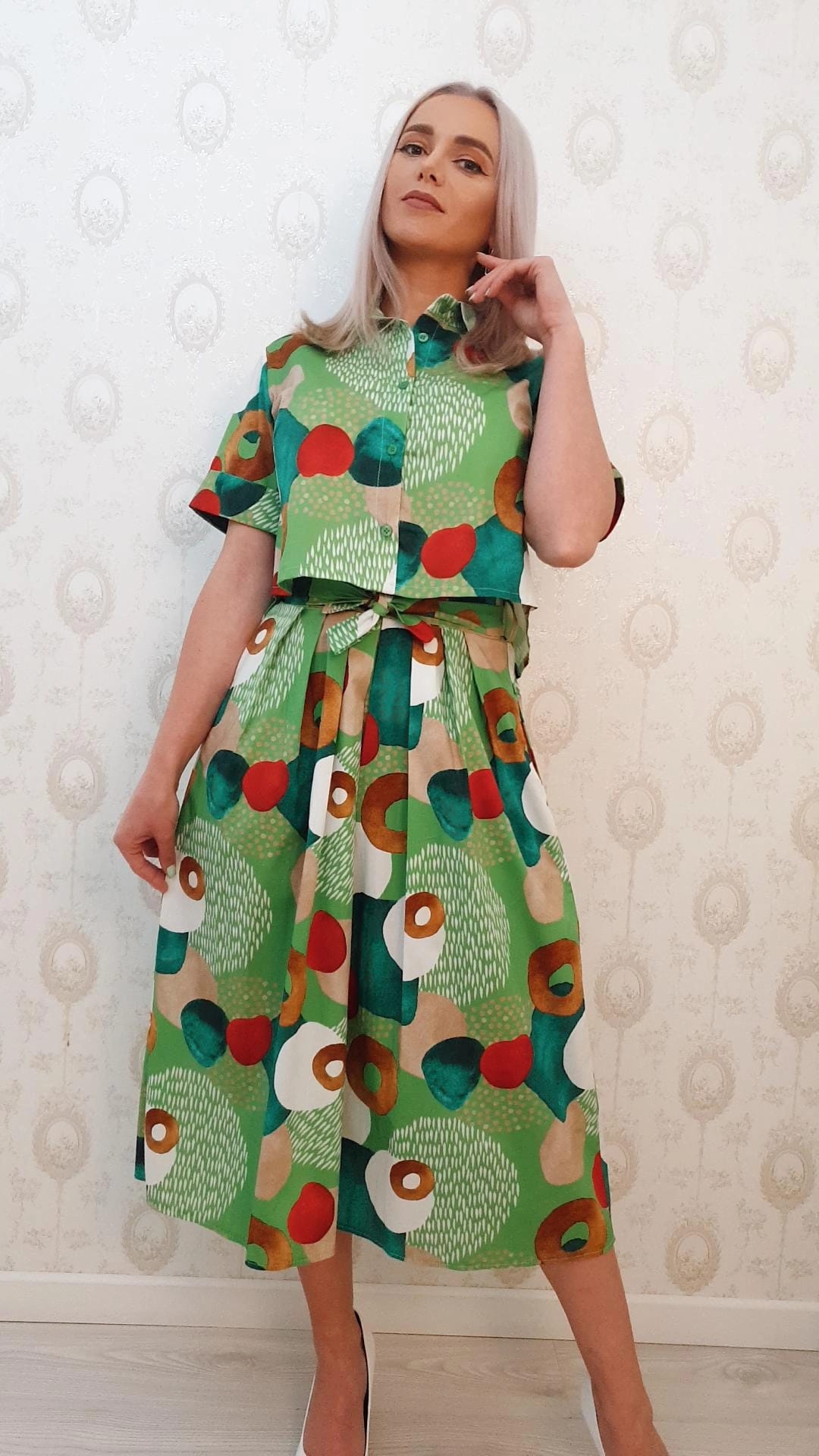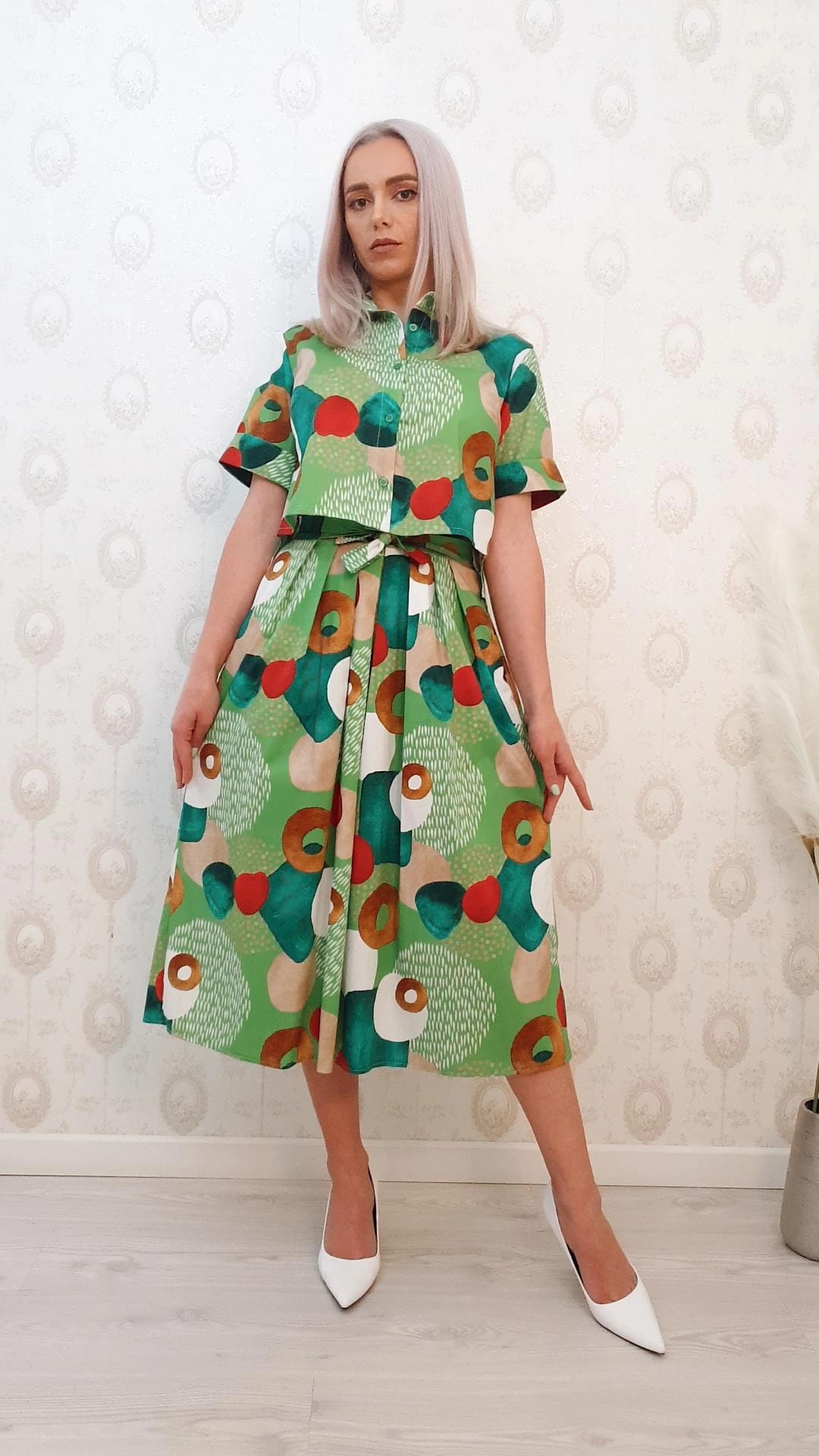 Compleu verde cu imprimeu,top camasa si fusta