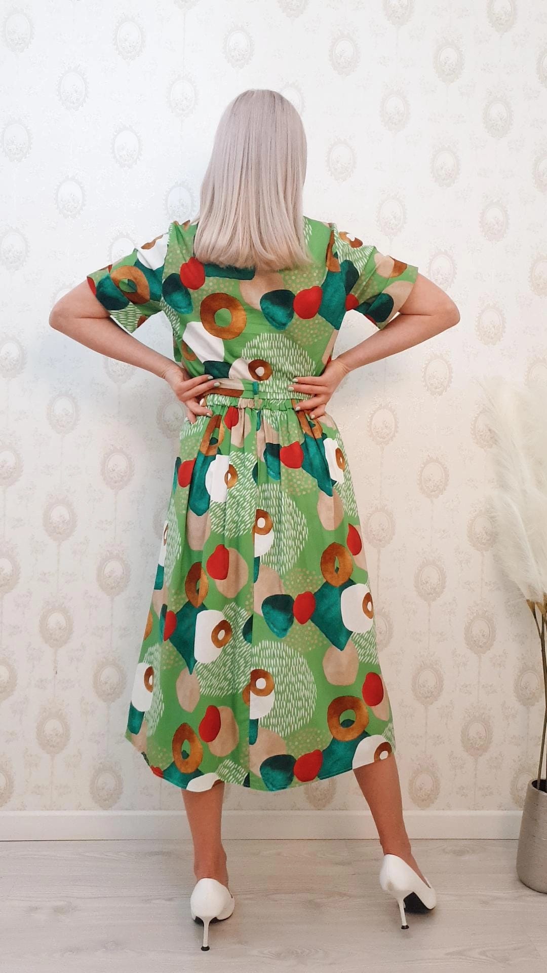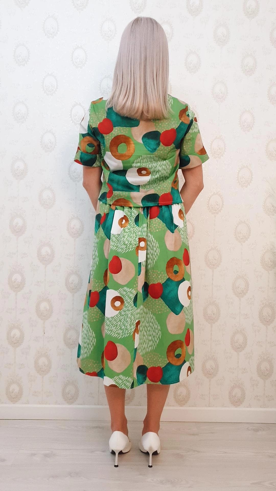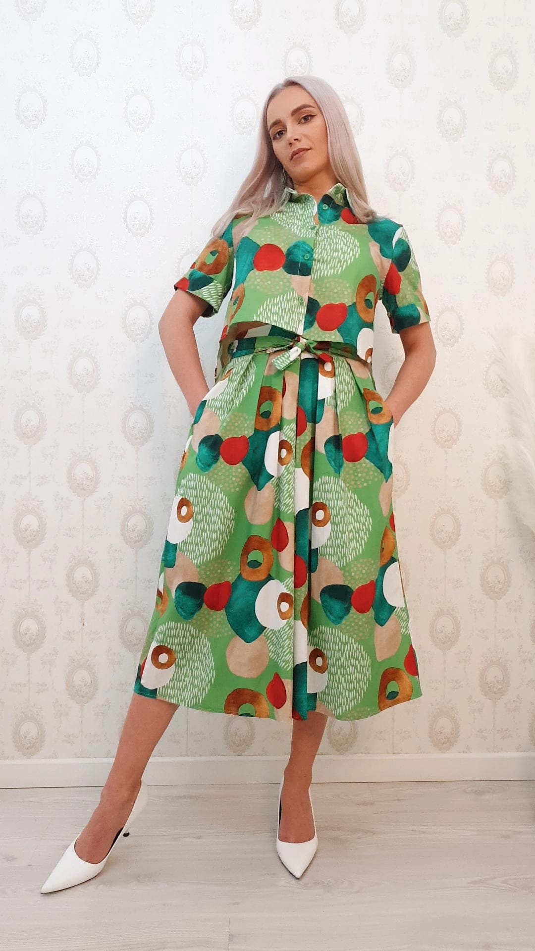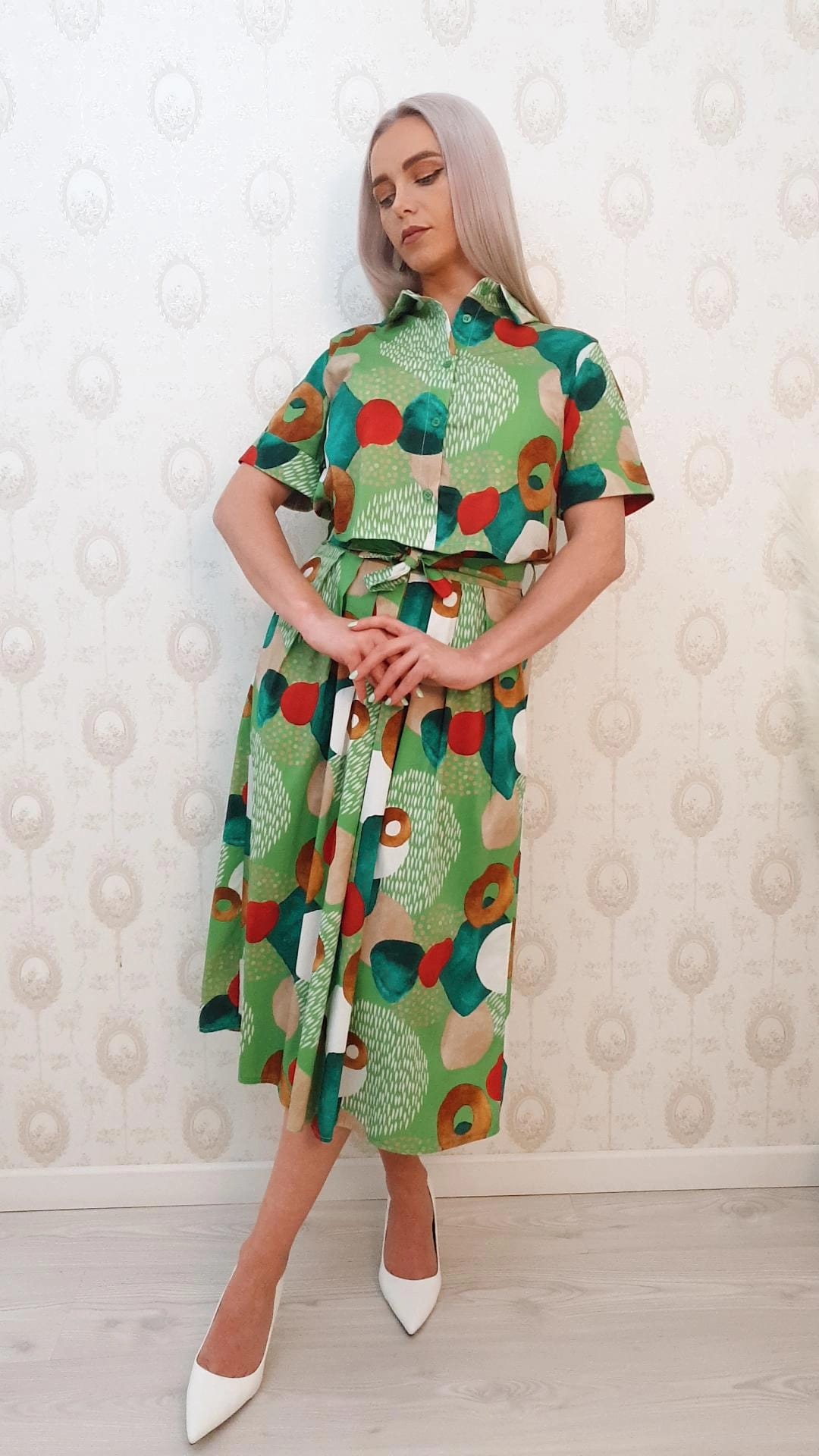 Compleu verde cu imprimeu,top camasa si fusta